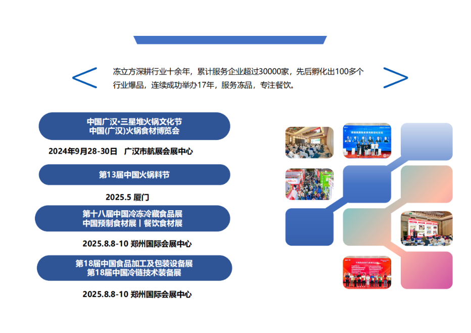 第十七屆中國冷凍冷藏食品展|第三屆中國預(yù)制菜展覽會(huì)|第十七屆中國餐飲食材展,將于2025年8月8日-10日在鄭州國際會(huì)展中心乘勢(shì)而起,煥新升級(jí)。8萬+平方米展會(huì)規(guī)模、十二館齊開、8大主題展區(qū)、 聚焦冷凍餐飲食材全產(chǎn)業(yè)鏈、上萬款行業(yè)新品首發(fā)、數(shù)千款爆品呈現(xiàn)、頭部品牌齊聚,覆蓋行業(yè)上中下游產(chǎn)業(yè),10萬+數(shù)據(jù)庫多渠道宣傳,深化供需對(duì)接,360°全網(wǎng)營銷,引爆行業(yè)關(guān)注。
