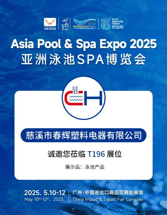 大家好!我司將參加2025年5月10-12日在廣州·中國進出口商品交易展會展館舉辦的“2025廣州泳池SPA博覽會”(Grandeur · Asia Pool & Spa Expo 2025),將為大家帶來Pool cover reel 泳池卷軸器、Pool ladder 泳池扶梯、Pool cleaning accessories 泳池清潔用品等配套設備。屆時,誠邀廣大客商朋友蒞臨廣州泳池博覽會到我司展位參觀交流,更多產品和服務優惠,歡迎各位到展會現場詳談!