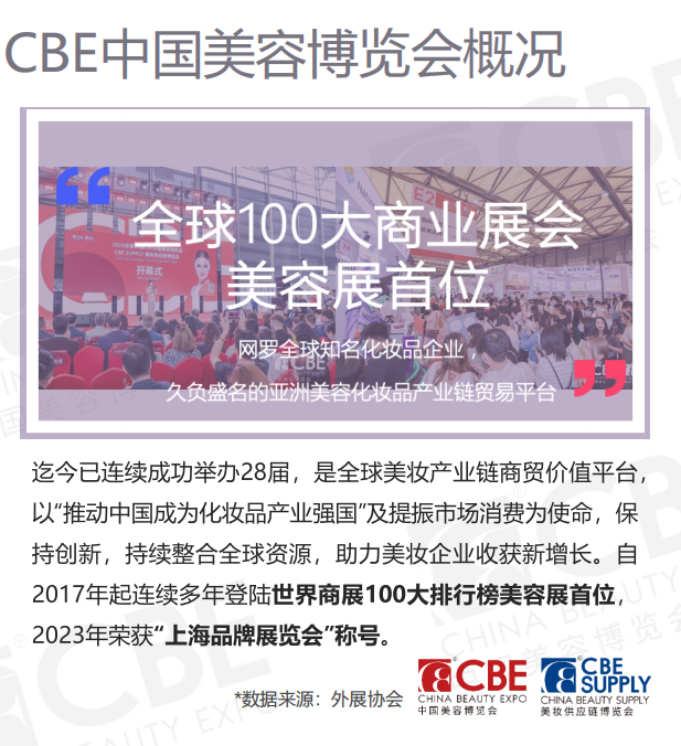 2026第30屆中國美容博覽會-上海浦東美博會第 30 屆 CBE 專業美容展美業全域新機遇,共啟未來新增長!2026 年 5 月12-14日 . 上海新國際博覽中心(浦東)3500 + 展商 ×1000 + 品牌 ×23 萬㎡展區,解鎖萬億市場新引擎!主辦方:上海百文會展有限公司 李經理 183-O174-O328 同V【展會核心升級亮點】1. 全產業鏈超級樞紐,覆蓋全域渠道3500 + 全球優質展商:匯聚專業美容、功效護膚、儀器設備、美甲美睫、大健康等全品類品牌,其中60% 為guojipinpai,40% 為國內新銳及laozihao。10 萬 + 線下核心渠道:覆蓋全國 31 省 25 個分會,鏈接專業美容院、皮膚管理中心、連鎖機構等實體終端;300+MCN 機構、5000+KOL、1000 + 私域精英同步打通線上流量入口。跨境貿易新通道:亞洲十國專業買家團、101 個國家及地區海外買家直連,全年100 + 主題配對會精準促成出海合作。2. 首發經濟 + quanwei背書,定義行業biaogan2026 百dapinpai榜單重磅揭曉:從 500 家企業中嚴選 100 個biaogan品牌,覆蓋八大類目,通過產品革新、技術突破、模式創新三大維度,樹立行業價值dianfan。政府指導 + 趨勢發布:上海市商務委員會全程指導,首發《2026 美業消費趨勢報告》,現場發布超 7 萬件新品,搶占 “全球新品首發上海” 流量高地。quanwei獎項矩陣:設立產品、品牌、科技三大年度獎項,聯合100 萬 + 官方傳播賬號(含行業媒體、KOL)全域曝光,助力品牌聲量躍升。3. 跨界融合新生態,解鎖增長密碼E5 館 “美業 + 健康” 主題展:聚焦 “科技抗衰 × 草本養生 × 頭皮管理”,呈現 AI 皮膚檢測、益生菌護膚、筋膜抗衰儀器等前沿跨界解決方案。彩妝 / 香氛 / 工具專區爆發:Z 世代 “情緒美妝” 趨勢下,爾木萄等頭部品牌攜 “精致美學” 工具矩陣、沉浸式香氛體驗場景亮相,引領 “顏值經濟 + 情緒價值” 雙消費引擎。【參展品牌價值解析】國貨突圍代表:爾木萄(展位號:W2-J09)美妝工具賽道wangzhe:憑借 “棉花糖粉撲” 連續兩年登頂行業 TOP1,“親膚柔巾” 年銷破 7500 萬元,雙 11 洗臉巾品類 TOP1,線下入駐4 萬家門店,2023 年營收增速超行業均值 3 倍。全域營銷范本:線上聯合 500+KOL 打造 “工具即妝容生產力” 心智,線下以 “高顏值陳列 + 高性價比” 成、KKV 等渠道引流爆品,現場將首發Z 世代定制化彩妝工具套裝,揭秘 “高效化妝 × 視覺愉悅” 雙輪驅動邏輯。laozihao煥新biaogan:孔鳳春(展位號:E1-K09)163 年草本科技傳承:從慈禧御用 “鵝蛋粉” 到敏感肌修護專家,依托非遺工藝與現代皮膚學,打造馬齒莧系列爆款,2023 年營收破億、增速 380%。國潮 2.0 創新實踐:現場首秀 “自然生命力” 修護系列,融合凍干技術與本草植萃,示范 “傳統成分 × 現代科技” 的跨界破圈路徑,解碼laozihao年輕化密碼。首次參展⑥ | 綻家:家清新品牌成交榜TOP,新西蘭家清標桿品牌重磅亮相第29屆CBE綻家“自然之力,綻現生活之美” 展位號E1-W15綻家(LYCOCELLE)是源自新西蘭的高端自然植萃品牌,是新一代家居清潔與個護領域的革新者,以“科學清潔美學”為核心,致力于為現代家庭提供健康、環保的家居清潔與衣物護理解決方案。自2017年創立以來,品牌秉承“天然、安全、高效”的理念,致力于為現代家庭打造健康、愉悅的清潔體驗。在全球家居清潔市場向 “天然、高效、細分” 加速升級的浪潮中,源自新西蘭的高端家居護理品牌「綻家」,即將于2025年5月12-14日攜“植萃清潔美學”矩陣產品登陸第29屆CBE中國美容博覽會。作為新西蘭天然清潔領域的標桿品牌,綻家以“天然成分×科學配方”為核心,用“分區護理+場景化解決方案”重新定義家居清潔的 “安全” 與 “精致”。此次首秀,品牌將在上海新國際博覽中心E1館W15展位,與全球 3200+美妝企業同頻共振,在“全球新品 首發上海”的美妝盛宴上,詮釋“科學清潔美學”的品牌哲學。【展會同期活動搶先知】板塊 核心內容 價值亮點趨勢論壇 全球美妝趨勢峰會:解讀成分黨、可持續美妝、男性護膚等熱點,發布《2026 功效護膚白皮書》 quanwei數據驅動產品研發與營銷策略技術大賽 美甲美睫 / 紋繡 / 皮膚管理實操賽,dingjian技師現場競技 挖掘行業人才,樹立技藝標準商貿配對 一對一渠道對接會,跨境貿易專場,私域流量運營閉門會 精準匹配資源,促成千萬級合作C 端種草日 KOL 現場直播選品,消費者體驗日,新品快閃店 同步打通 B 端招商與 C 端聲量,實現品效合一【立即參與,搶占三大紅利】展商權益獲得《美業渠道資源》,直通 10 萬 + 線下網點與跨境買家優先參與 “百dapinpai” 評選,享受官方媒體矩陣全年曝光免費入駐 CBE 線上展廳,獲取 365 天不間斷貿易機會