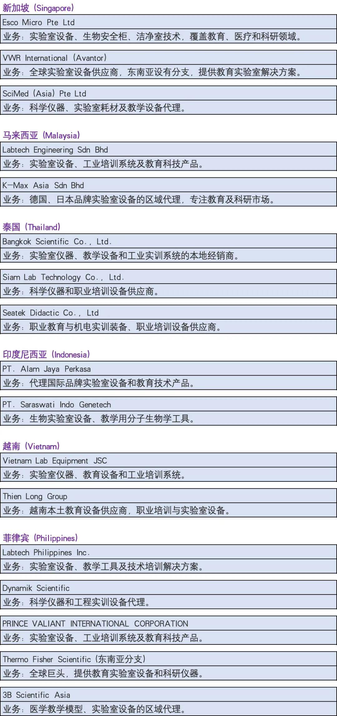 東南亞地區(qū)活躍的教育裝備、實(shí)驗(yàn)室儀器及實(shí)訓(xùn)設(shè)備的經(jīng)銷(xiāo)商或代理企業(yè),涵蓋多個(gè)國(guó)家及領(lǐng)域。這些公司提供科學(xué)實(shí)驗(yàn)室設(shè)備、職業(yè)培訓(xùn)系統(tǒng)、教育技術(shù)解決方案等。
