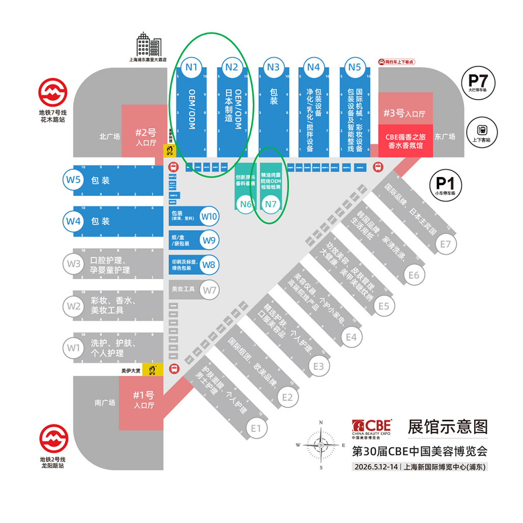本次OEM/ODM主題展區分布于N1/N2/N6/N7館,300 +實力展商齊聚,13大核心品類一應俱全,從護膚、彩妝到家用儀器、口服美容等,全方位展現美妝制造的完整生態。各館具體分布如下: