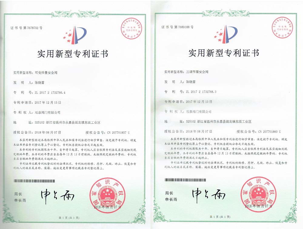 雙泰閥門喜獲四項(xiàng)國家專利證書