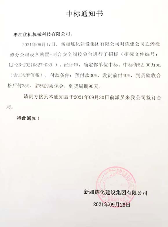 浙江優機再次成功中標中石油新疆煉化建設集團閥門試驗校驗項目